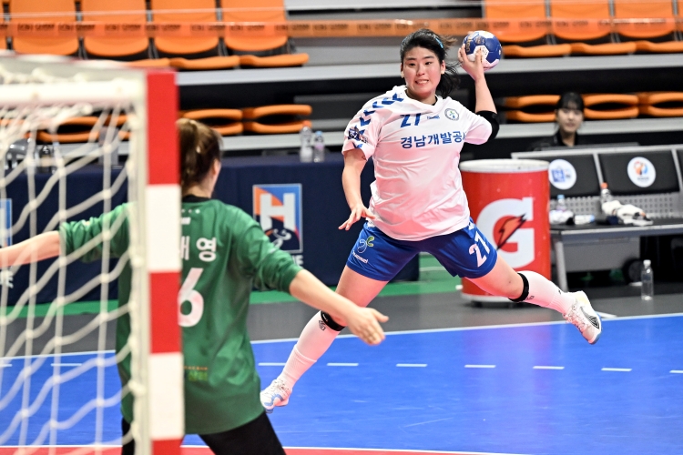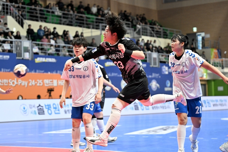 다시 한 골씩 주고받는 팽팽한 접전이 이어지다 경남개발공사의 실책이 연달아 나오면서 김민서의 연속 골로 삼척시청이 10-8, 신은주의 윙 슛으로 19분에 11-8, 3골 차까지 달아났다.