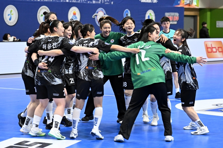 6일 삼척시민체육관에서 열린 '신한 SOL페이 24-25 핸드볼 H리그' 삼척시청과 경남개발공사의 경기에서 삼척시청 선수들이 정규리그 준우승을 확정 지은 후 기뻐하고 있다. [사진=한국핸드볼연맹]