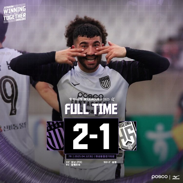 전남드래곤즈가 12일 오후 2시 화성종합경기타운에서 열린 '하나은행 K리그2 2025' 7라운드 화성FC 원정에서 2-1로 승리하며 시즌 첫 연승을 기록했다.