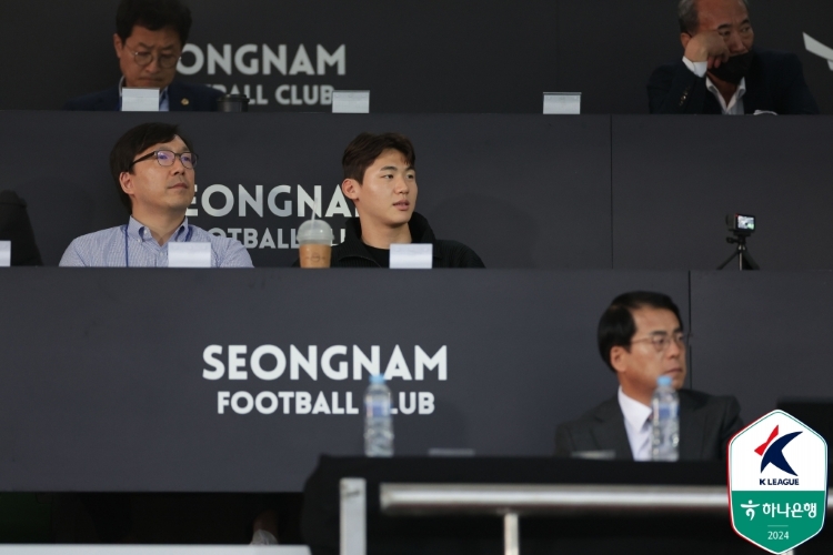 지난해 5월 탄천종합운동장을 방문한 잉글랜드 프리미어리그 브렌트퍼드FC 소속 김지수(가운데)가 경기를 관람하고 있다. [사진=한국프로축구연맹]