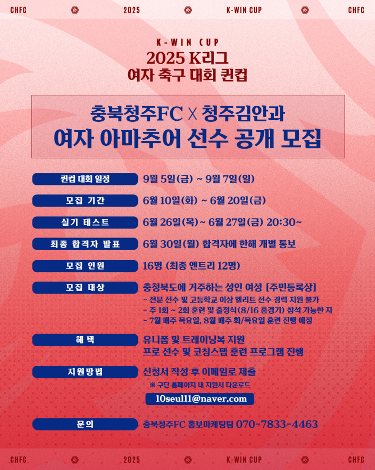 이번 대회에 출전할 선수 모집 기간은 10일부터 20일까지이며, 주민등록상으로 충청북도가 거주지로 등록돼 있는 여성만 신청할 수 있다. 신청 방법은 구단 홈페이지에서 신청서를 확인하고 작성해 이메일로 접수하면 된다.