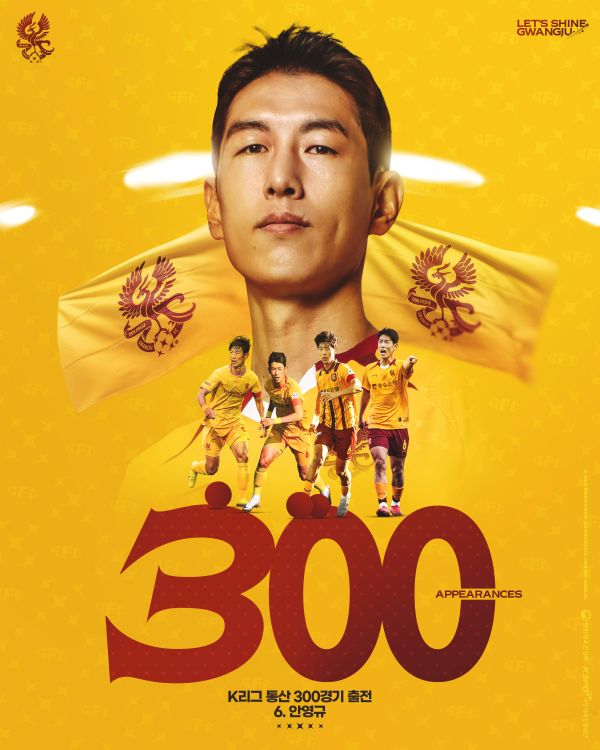 한편, 광주 구단은 다가오는 10월 4일 대구FC와의 정규리그 마지막 홈 경기에서 안영규의 300경기 기념 시상식을 진행할 예정이다. 티셔츠, 머플러, 페넌트 등 특별 제작한 기념 굿즈도 판매한다. 해당 굿즈는 지난 1일부터 절찬리 판매 중이며, 구단 공식 온라인 스토어에서 구매할 수 있다.