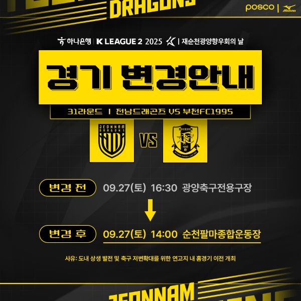 전남은 '하나은행 K리그2 2025' 31라운드 부천FC1995와의 홈 경기를 오는 27일 오후 2시 순천팔마종합운동장에서 치를 예정이다. 순천 홈 경기 개최는 순천 및 인근 지역민들에게 프로축구 관람 기회를 제공하고 지역 내 축구 저변 확대 및 축구 붐 조성을 위해 결정됐다.